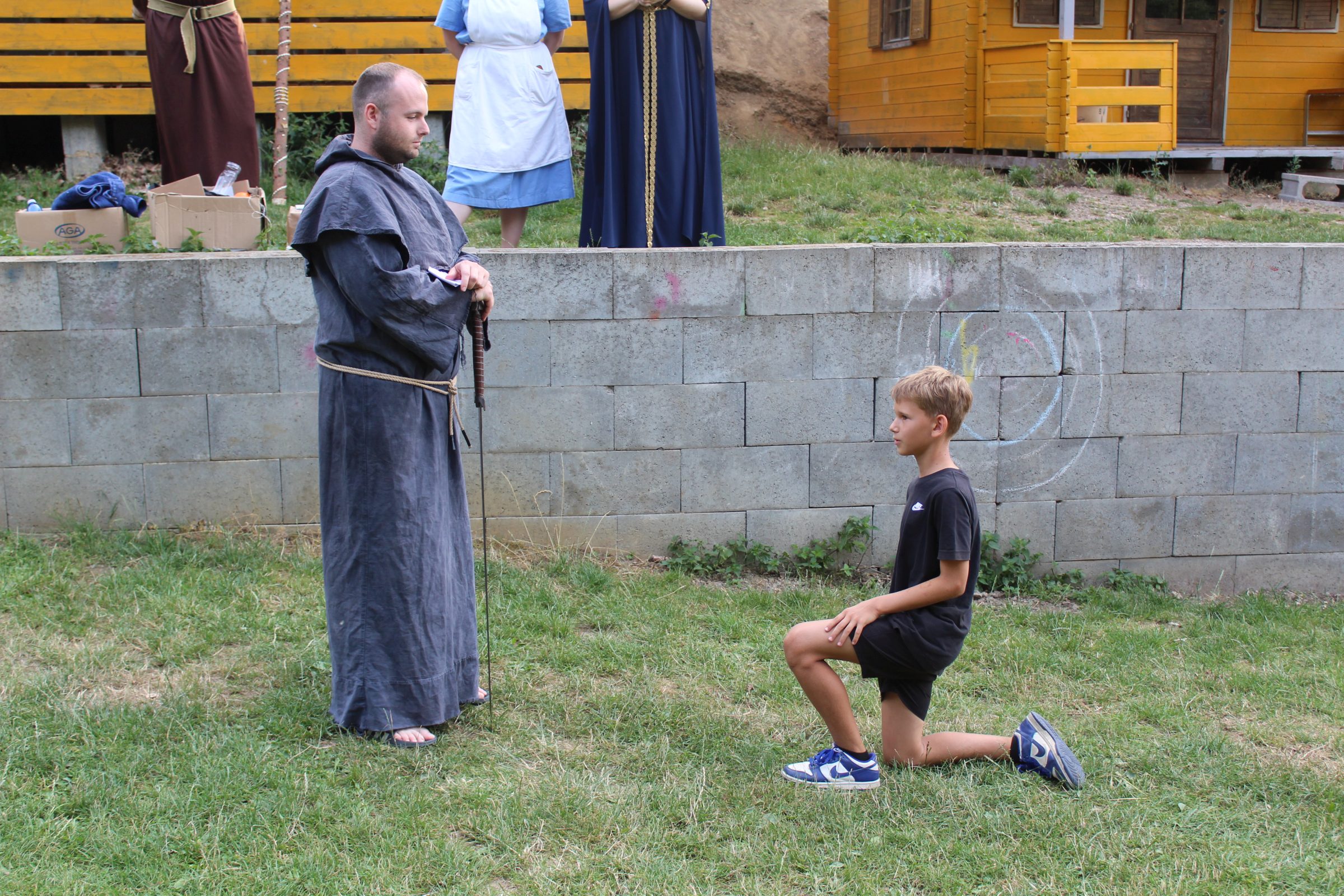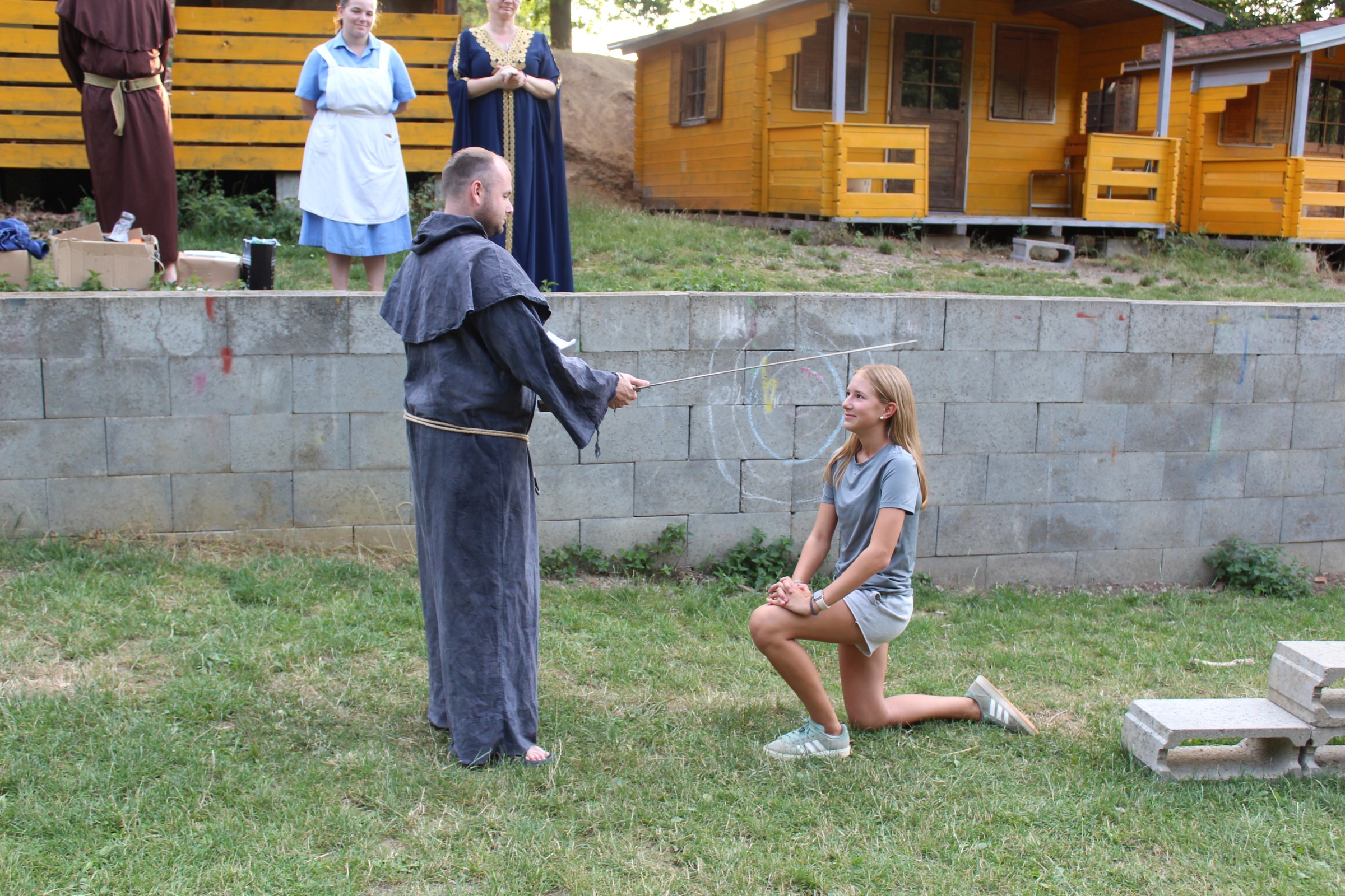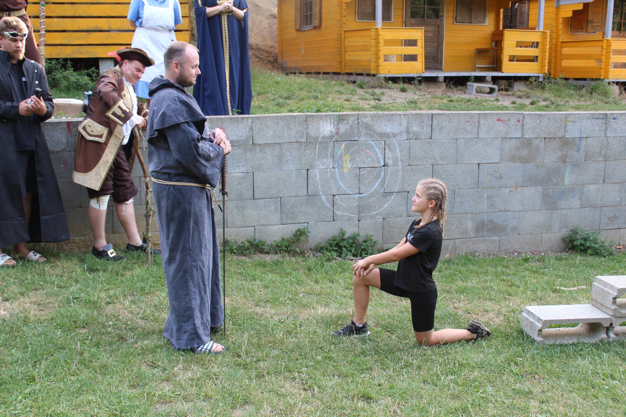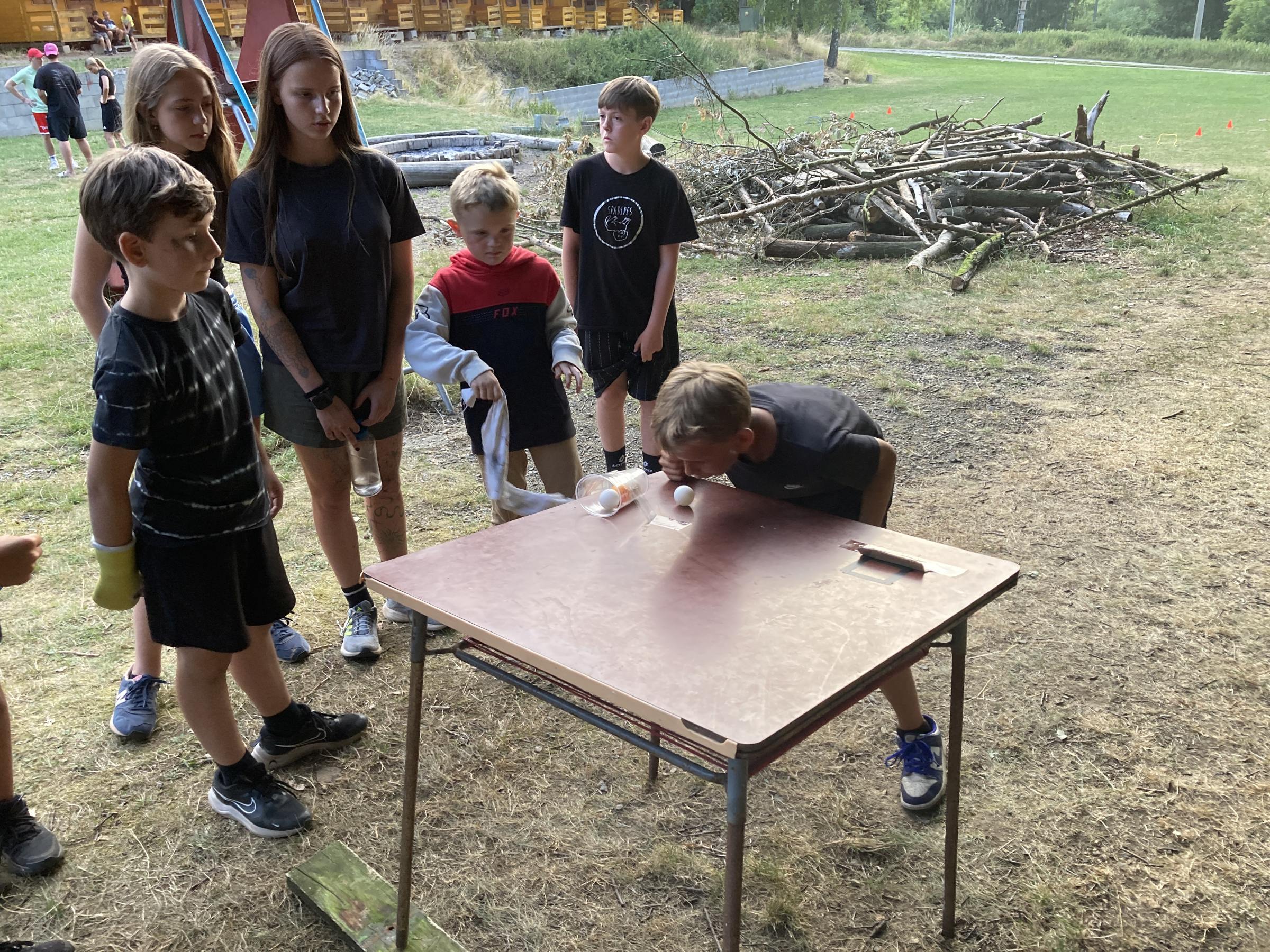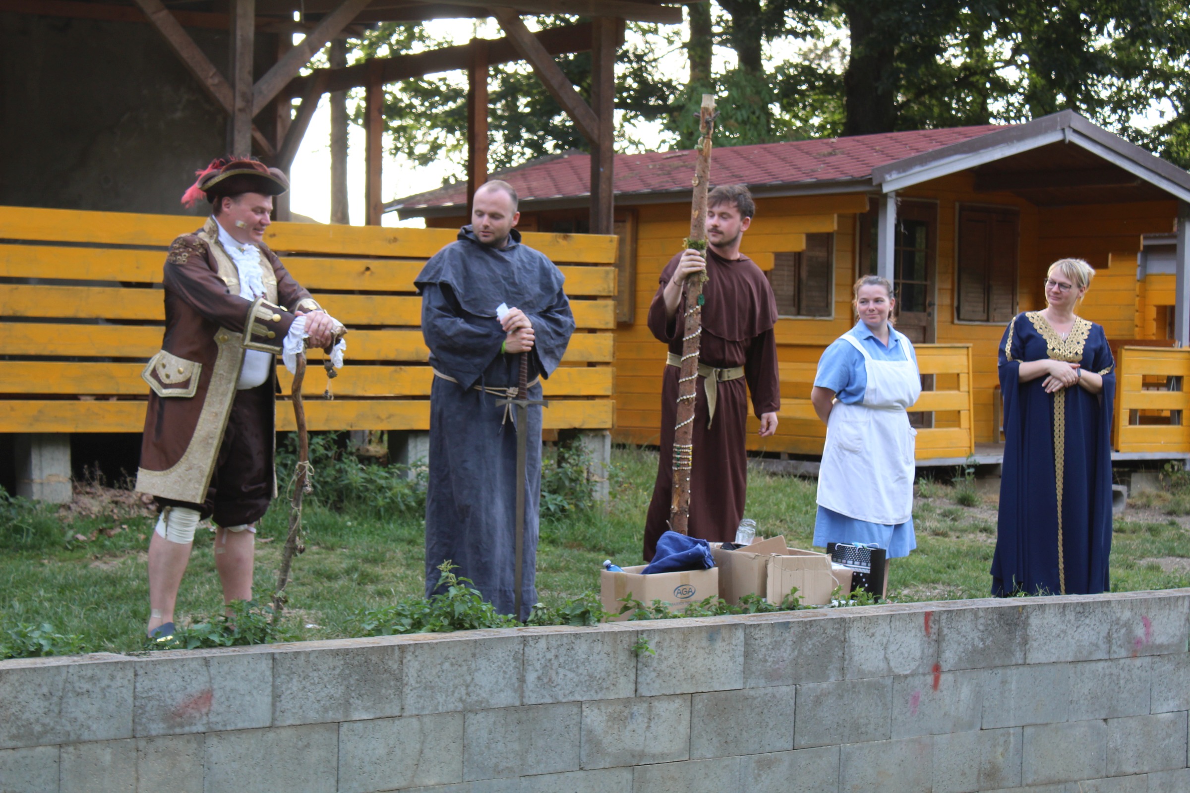 Dnes nás čekal velmi náročný den plný adrenalinu, vytrvalosti a odvahy, proto se omlouváme za pozdní aktualizaci našich stránek. Hned z rána proběhla sportovní zápolení ve vybíjené a fotbale. Napínavá klání probíhala na kvalitní úrovni, ale vyhrát mohl jenom někdo. Hlavně, že se všichni dobře bavili. Síly jsme doplnili výborným smaženým květákem s bramborem. Během poledního klidu byla opět prověřena odolnost a šikovnost soutěžících v Poháru rytíře Raka. Někdo musel z kola ven a finálová kola se blíží. Odpoledne si táborníci vyzkoušeli soutěžení ve stolním fotbálku, ping-pongu, frisbeegolfu, střelbě kuší, hodu na basketkoš, kopu na branku, bolloballu a šipkách. Po povečeření těstovinového salátu následoval nástup. Proběhlo povyšování nejšikovnějších hrdinů, ale i ponižování neposlušných tovaryšů. Nejdůležitější zprávou dne ovšem bylo, že se nám probral vévoda Jan, dobitý, poblouzněný a neschopen přebrat vládu ve svém vévodství. V rámci svého léčení se prochází po vévodství, hledá ztracenou paměť a neuvěřitelně blábolí. Večer proběhl další střet, tentokrát mezi lidmi a upíry. Upíři prokázali, že jsou při síle a uštědřili oslabeným lidem drtivou porážku. Lidé a vlkodlaci tedy mají motivaci do posledního souboje, aby si zlepšili morálku před finálovým kláním. Byl to náročný den a všichni se jistě těšili do svých postýlek, ale to ještě netušili (no, někteří to tušili a netrpělivě očekávali už několik dní), že přijde na řadu noční stezka odvahy. Všichni se vzbudili, překonali svůj strach i zívání a v pořádku se vrátili zpět do tábora. Unavení, ale plní zážitků usínali s očekáváním, co nás vše ještě čeká…